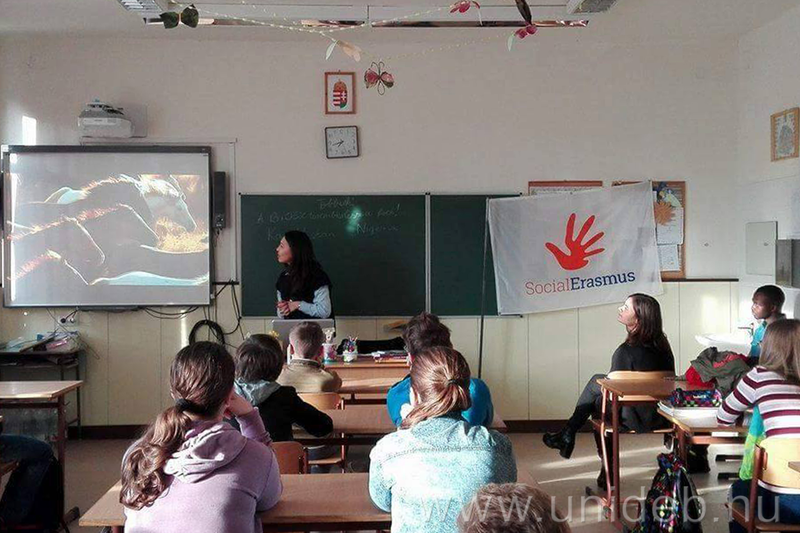 A SocialErasmus Week zárásaként az ebesi Arany János Magyar-Angol Kéttannyelvű Általános Iskola és Alapfokú Művészetoktatási Intézmény 7. osztályos tanulóihoz látogatott el egy kazah lány és egy nigériai fiú a szervezők kíséretében. A külföldi hallgatók bemutatták országukat és röviden jellemezték kultúrájukat.