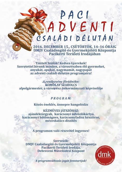 A korábbi híradásokkal ellentétben a Paci adventi családi délutánt nem december 8-án, hanem december 15-én, 14 és 16 óra között szervezik meg a DMJV Családsegítő és Gyermekjóléti Központ Paci kerti területi irodájában.