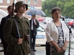 A Nagyállomás épületének falán lévő emléktáblánál Magyar Posta Zrt. Kelet-magyarországi Területi Igazgatóságának vezetője, Rácz Tamásné emlékezett. Szavai szerint 74 évvel ezelőtt sütött a nap, mégis szomorúság várt Debrecenre. 9 óra körül érkezett be a legtöbb vonat az állomásra. Bár a szirénák jelezték a lakosságnak, hogy nagy baj közeledik, az emberek el sem tudták képzelni, hogy egy ekkora városban, ilyen szeretetben élő közösségben valaki is kárt akar tenni. Azon túl, hogy háborús időszak volt, erre az eseményre ma sincs igazán magyarázat. A bombák célt is tévesztettek, hiszen nem annyira a vasútállomást, mint inkább a vagyongyárat és a mai Petőfi tér területét sújtotta a bombázás, olyannyira, hogy például a hajdani Erzsébet utca épületei gyakorlatilag a földdel váltak egyenlővé. Az emberek menekültek, de éppen az állomás közelében lévő óvóhely volt az, ami bombatalálatot kapott. A két órán keresztül tartó iszonyat után rövid idővel az emberek – köztük a vasutasok és a postások is – már azon gondolkodtak, hogyan lehetne visszaállítani az eredeti rendet. Ezeknek az embereknek, s a bombázás áldozatainak a tiszteletére 1993-ban sikerült emléktáblát elhelyezni a jelenlegi Nagyállomás épületének falán, s azóta minden évben június 2-án van hol emlékezni. Rácz Tamásné hangsúlyozta: a múlt fájdalmait, nehézségeit, bajait elfelejteni nem szabad, s nem csak azért, hogy többé ne kerüljünk hasonló helyzetbe, hanem azért is, hogy emlékeztessük magunkat arra: a közösségeknek a bajt követően képeseknek kell lenniük talpra állni, újrakezdeni az életet, tudni kell erősebben, okosabban élni, okulni azokból az eseményekből, melyeket szerencsétlenségként éltünk meg. A területi igazgató reményét fejezte ki annak kapcsán, hogy a közeljövő jelentős fejlesztéseként létrejövő Főpályaudvar épületén is helye lesz majd ennek az emléktáblának.