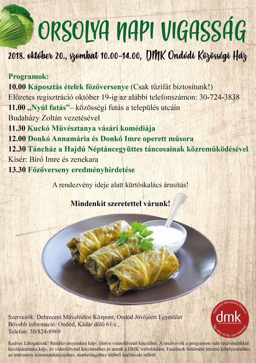 Orsolya napi vigassággal várja vendégeit a Debreceni Művelődési Központ Ondódi Közösségi Háza 2018. október 20-án szombaton 10.00-14.00 óráig.