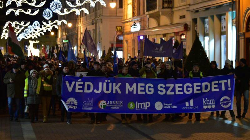 A Védjük meg Szegedet! címmel meghirdetett demonstráció résztvevői a Dugonics téren gyülekeztek, majd a belvároson keresztül a Csongrád Megyei Kormányhivatal Rákóczi téri épülete elé a Nagy Imre-szoborhoz vonultak.