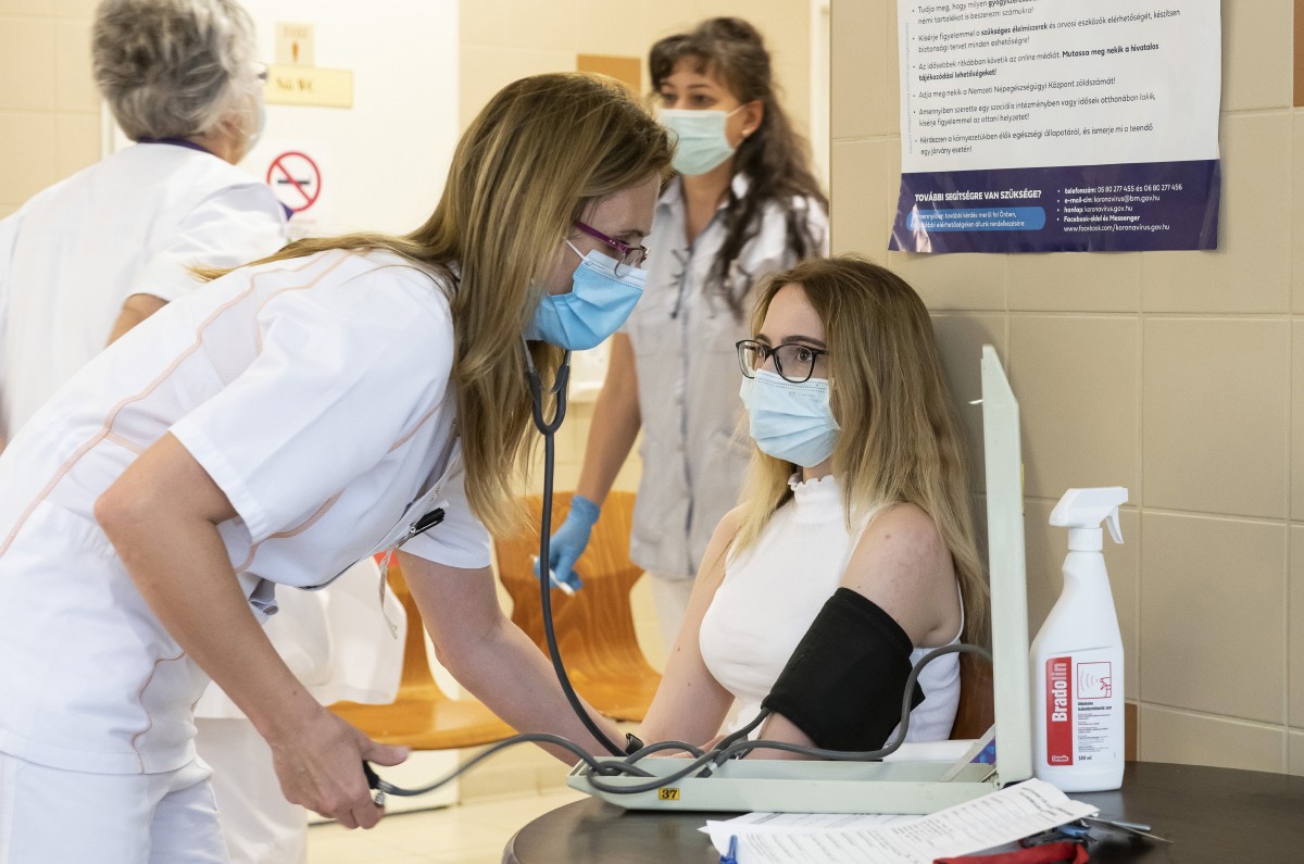 Megmérik egy fiatal vérnyomását, mielőtt beoltják a német-amerikai fejlesztésű Pfizer-BioNTech koronavírus elleni oltóanyag, a Comirnaty-vakcina első adagjával a Szabolcs-Szatmár-Bereg Megyei Kórházak és Egyetemi Oktatókórház Sántha Kálmán Szakkórházában kialakított oltóponton Nagykállóban.