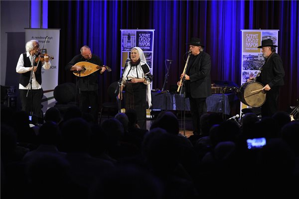 Petrás Mária népdalénekes (k) valamint a Muzsikás együttes tagjai, Sipos Mihály (b), Porteleki László (b2), Éri Péter (b3) és Hamar Dániel (j) koncertet adnak a Szent László-napok nyitógáláján a Nagyváradi Állami Filharmónia koncerttermében 2016. június 20-án. MTI Fotó: Czeglédi Zsolt
