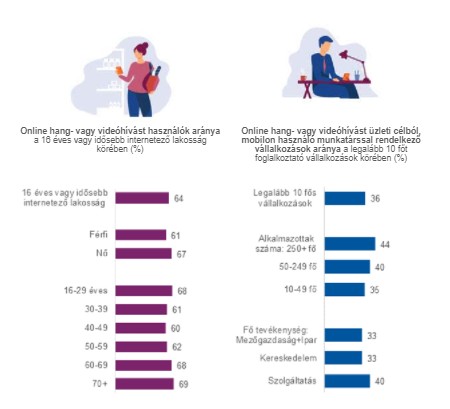 A vállalatok is előszeretettel alkalmazzák az internetalapú hangmegoldásokat. A legalább tíz főt alkalmazó üzleti vállalkozások – kb. 38 ezer ilyen van – 36 százalékánál minimum egy alkalmazott használ a munkához online hang- vagy videótelefon-szolgáltatást a mobiltelefonján. A felhasználók aránya jelentősen magasabb a nagyobb, legalább 250 főt foglalkoztató cégeknél – 44 százalékuk használja –, valamint az egymilliárd forint feletti bevételű és a szolgáltatói szektorban tevékenykedő vállalatoknál.