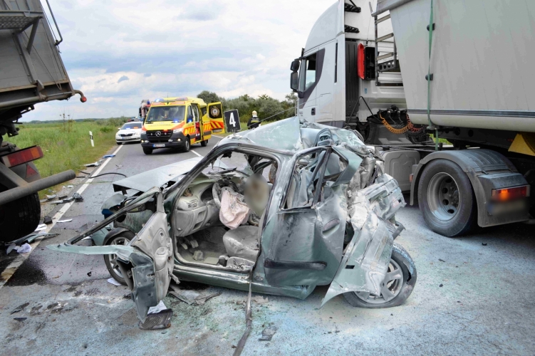 Egy férfi közlekedett teherautójával 2019. július 12-én 14 óra körül a 33-as számú főúton Hortobágy felől Debrecen irányába, amikor figyelmetlensége miatt későn vette észre, hogy előtte egy műszaki hibás kamion miatt megállt egy személyautó. A 27 éves férfi fékezett, azonban már nem tudta elkerülni a balesetet, és belecsapódott a gépkocsiba, amit nekitolt az előtte álló kamionnak. A személyautó az ütközés után kigyulladt, a lángokat az arra járó járművezetők, valamint a két kamion vezetője oltotta el. A kocsi sofőrjét életveszélyes sérülésekkel vitték kórházba a mentőszolgálat munkatársai, azonban a szakszerű orvosi ellátás ellenére a nő életét vesztette.