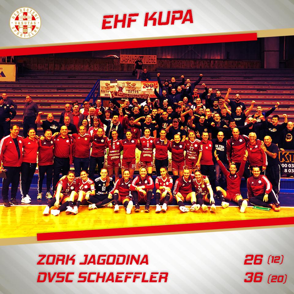 A Debrecen kettős győzelemmel csoportkörbe jutott a női kézilabda EHF Kupában, mivel 36-26-ra nyert a szerb bajnok ZORK Jagodina otthonában a selejtező harmadik fordulójának szombati visszavágóján. A hajdúságiak mellett az Érd és a címvédő Siófok is sikerrel vette a selejtezőt.