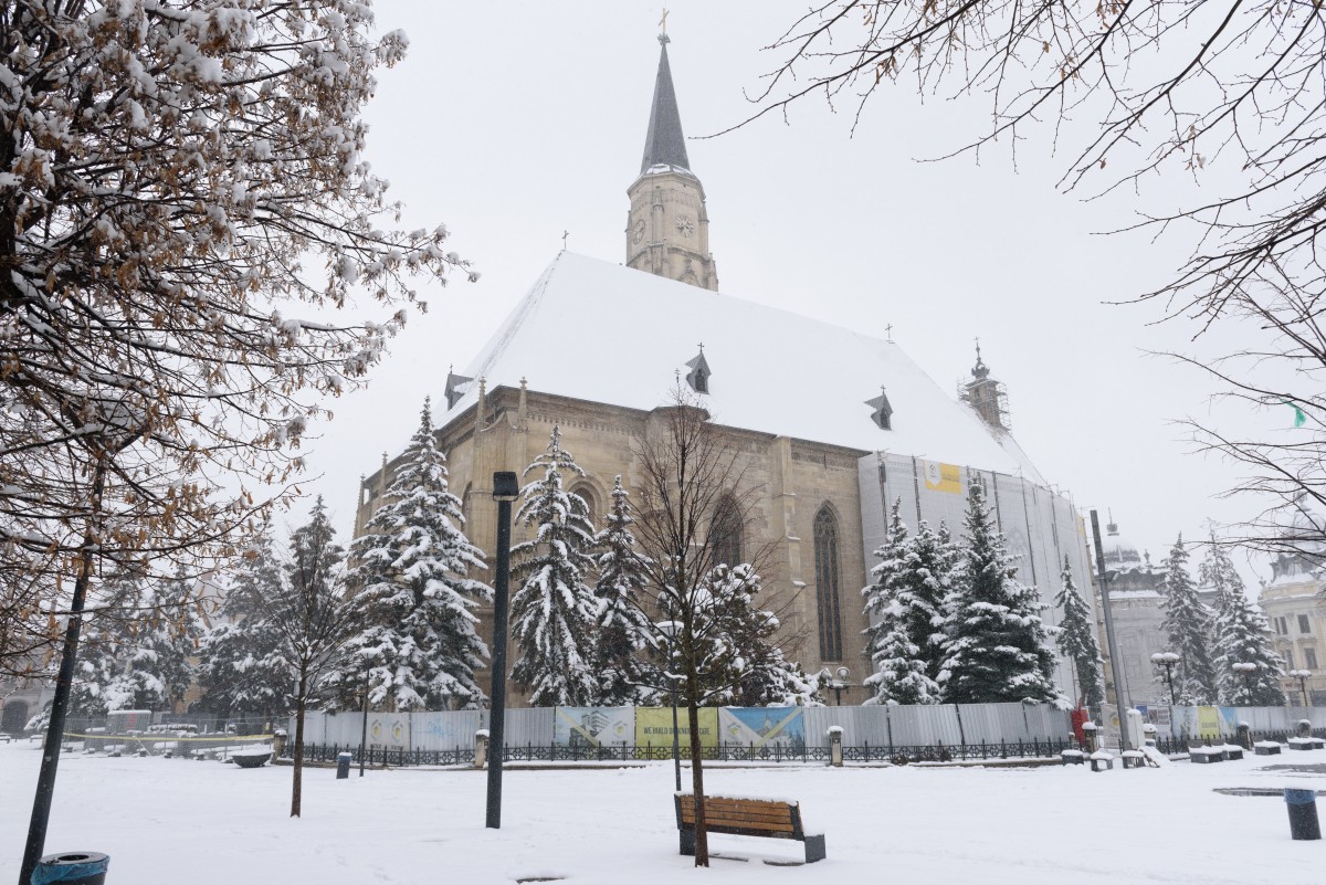 Kolozsvár, 2020. március 23. A behavazott Szent Mihály-plébániatemplom Kolozsvár főterén 2020. március 23-án