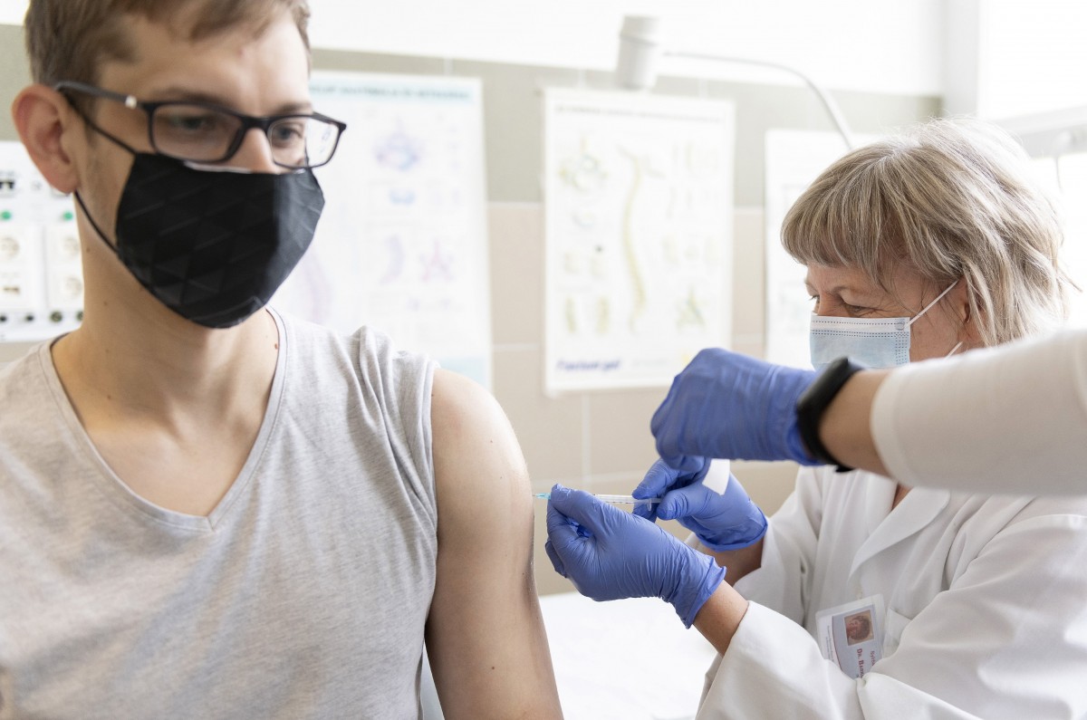Barkóczi Katalin reumatológus főorvos beolt egy férfit a Pfizer-BioNTech koronavírus elleni vakcina második adagjával a Szabolcs-Szatmár-Bereg Megyei Kórházak és Egyetemi Oktatókórház nyírbátori szakrendelőjében kialakított oltóponton 2021. május 15-én.