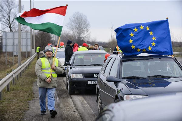 Résztvevők a félpályás útlezáráson a 4-es főút és az M35-ös autópálya kereszteződésének közelében 2015. január 30-án. A demonstrálók az M35-ös autópálya a 4-es főút csomópontjától az ondódi lehajtóig húzódó, útdíjkötelessé vált, 2,5 kilométeres szakaszának díjmentessé tételéért tüntettek. MTI Fotó: Czeglédi Zsolt