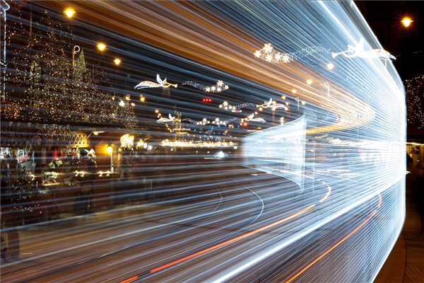 A hosszú expozíciós idővel készült felvételen DKV Debreceni Közlekedési Zrt. fényfüzérekkel feldíszített villamosa halad a debreceni Kossuth téren 2015. december 1-jén. Az adventi villamosok január 6-ig, vízkeresztig közlekednek. MTI Fotó: Czeglédi Zsolt