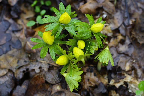 Virágzó téltemető (Eranthis hyemalis) a debreceni nagyerdőben, a Békás-tó közelében 2016. január 29-én. Az enyhe időjárás miatt az avar alól előbújt és virágzásnak indult a hazánkban védett növény. MTI Fotó: Czeglédi Zsolt