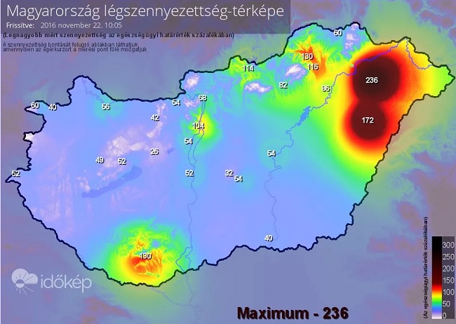 Kedd délelőtt az Időkép szmogtérképe azt mutatta, hogy Debrecenben, és környékén a légszennyezettség mértéke a megengedett érték 172 százaléka.A helyzet később javult, most már határérték alattiak az értékek, ahogy azt a legfrissebb adatok mutatják: