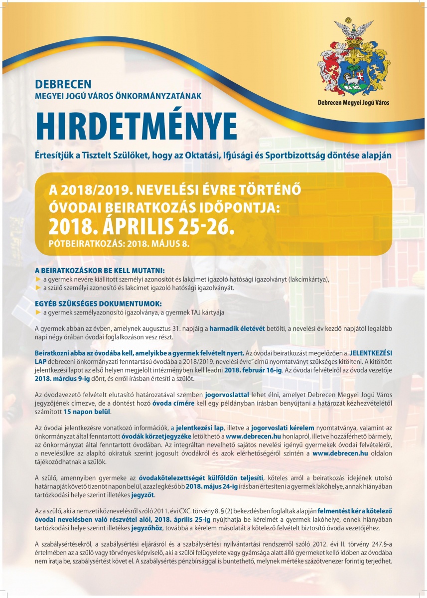 A 2018/2019-es nevelési évre az óvodai beiratkozás időpontja Debrecenben április