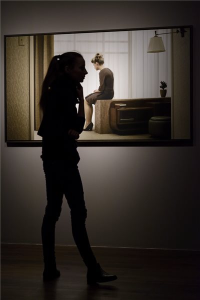 Egy látogató a Bánat-sorozat Irene című képe előtt Erwin Olaf holland fotográfus Körhinta című kiállításán a debreceni Modem Modern és Kortárs Művészeti Központban 2014. október 25-én. MTI, Fotó: Czeglédi Zsolt.