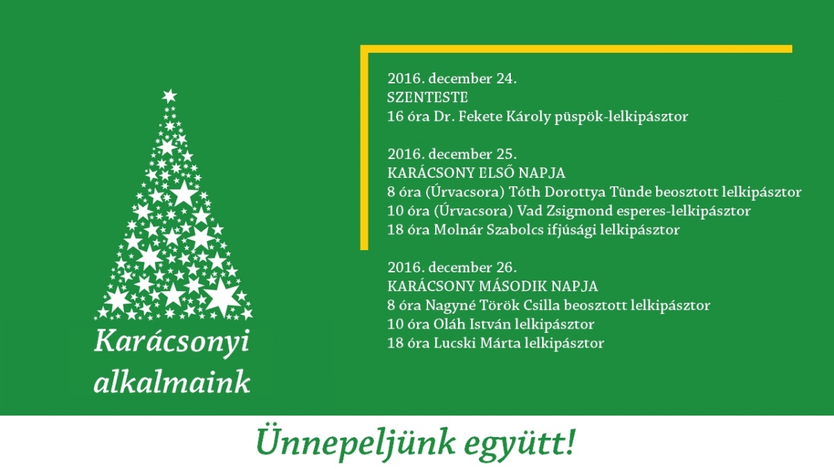 Karácsonyi istentiszteleti rend a Nagytemplomban Kultúra december 22, 2016Szabolcs SzilágyiSzóljon hozzá a Karácsonyi istentiszteleti rend a Nagytemplomban bejegyzéshez Istentiszteleti rend az ünnep alatt.