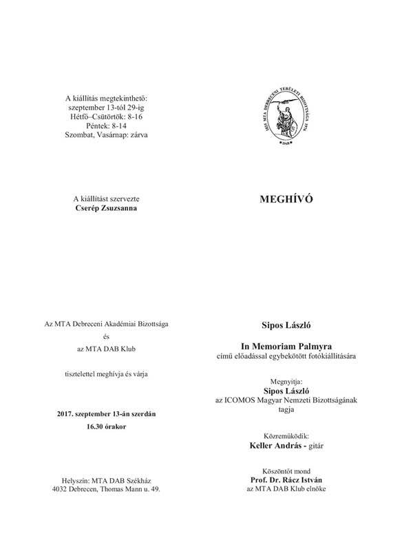 Sipos László In Memoriam Palmyra címmel tart előadást a Dab Székházban, majd tárlat is nyílik.. A kiállítás szeptember 13-29. között tekinthető meg.