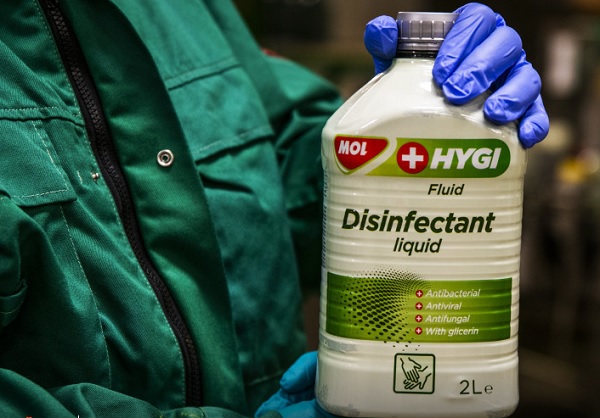 Azt írták: a koronavírus-járvány globális elterjedésével az egész világon hatalmas lett az igény a kéz- és felületfertőtlenítők iránt. Ezért a Mol-csoporthoz tartozó és kenőanyagok gyártásával foglalkozó Mol Lub Kft. két hét alatt átállította almásfüzitői üzemének egyik, korábban szélvédőfolyadékot készítő gyártósorát fertőtlenítőgyártásra. Az egység március utolsó napjaiban kezdte meg a termelést.
