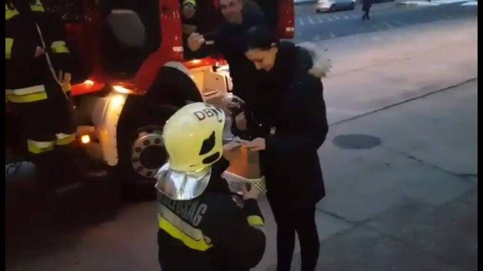 A reggeli szolgálatváltás előtt bajtársaival a gépjárműfecskendőbe ültek, majd a szerállás felől érkező Viktória elé fordultak kéklámpával. Bence kipattant az autóból, majd letérdelt Viki elé.